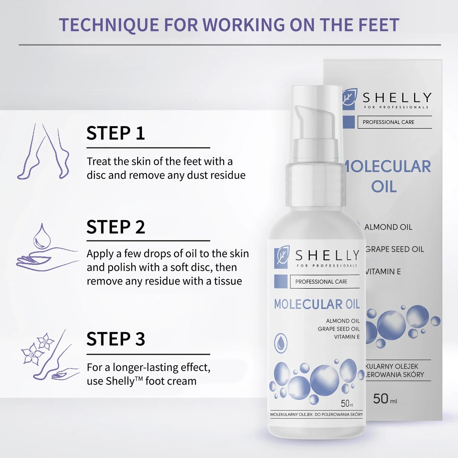 El aceite molecular para pies de Shelly está desarrollado profesionalmente para alisar la piel de los pies. Tiene una textura oleosa ligera y un aroma agradable.