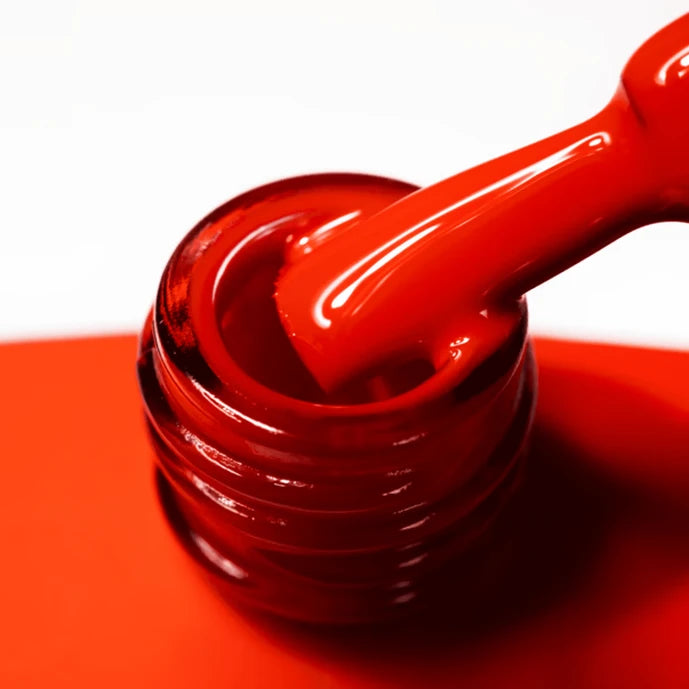 HEYLOVE Gel Polishes – vernis gel premium à haute pigmentation et consistance moyenne. Facile à appliquer, ne coule pas sur la plaque de l’ongle. Pour une manucure rouge glamour sur ongles longs, 1–2 couches suffisent.