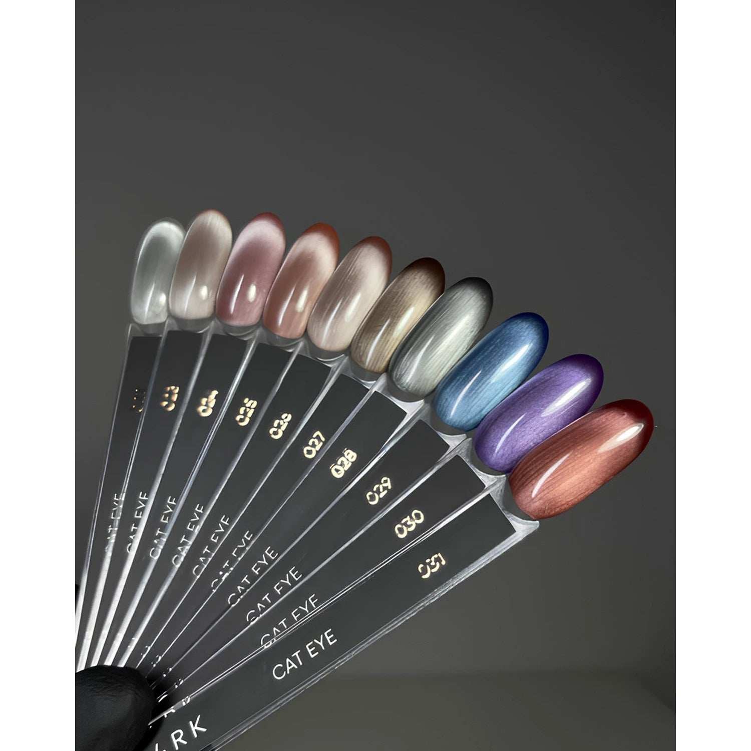 - Apply a thin layer of DARK Cat Eye gel polish and, before curing, hold a magnet in any direction (vertical, horizontal, or at an angle) for 3–5 seconds. Cure: LED — 90 seconds, UV — 2 minutes.