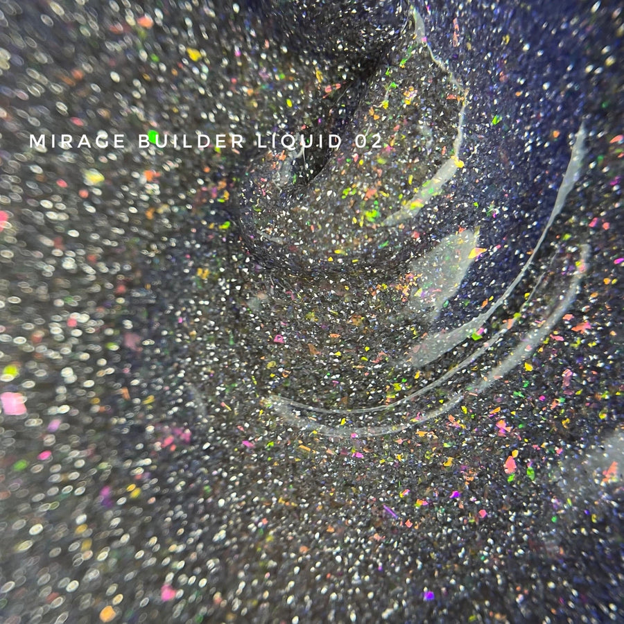 MIRAGE BUILDER LIQUID — a symbiosis of builder gel and cover base containing reflective particles that create a light-reflecting effect. Under natural daylight it provides a subtle highlighting shimmer, while under artificial lighting it delivers a deep, glowing effect.